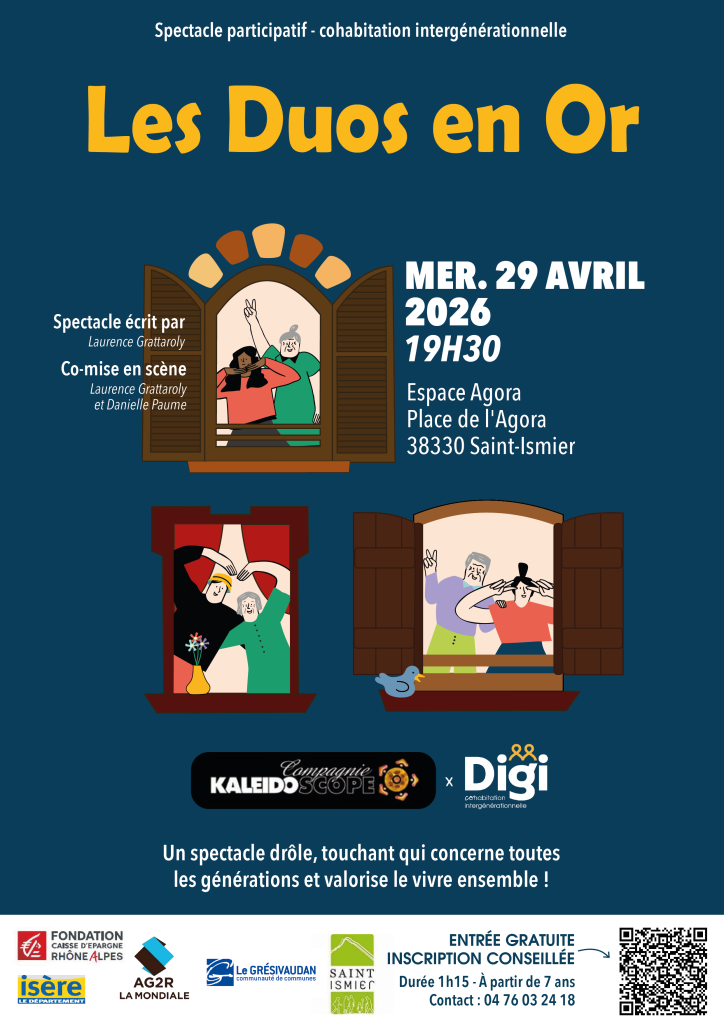 Si vous êtes du coté de Saint Ismier mercredi 29 avril ne manquez pas un spectacle drôle et touchant autour de la cohabitation intergénérationnelle, imaginé par La Compagnie Kaléidoscope. Les duos en or, un évènement pour découvrir autrement la solidarité entre générations, organisé par l’association Digi !